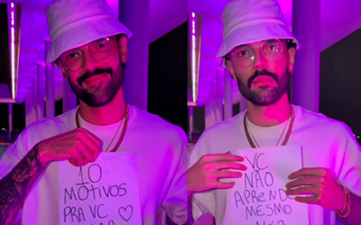 “10 motivos para você voltar com o seu ex”, inicia o cantor segurando uma placa, para depois revelar a seguinte mensagem: “você não aprende mesmo né?”.