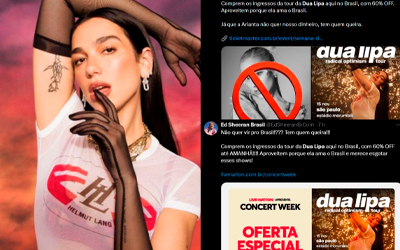 Nesta semana, Ariana Grande e Ed Sheeran anunciaram as primeiras datas de suas respectivas turnês mundiais para ano que vem. Porém, o Brasil acabou ficando de fora de ambas as agendas, ao menos num primeiro momento. As centrais de fãs de ambos os artistas fizeram postagens divulgando os shows de Dua no Brasil: “Se você não quer, tem quem queira”.