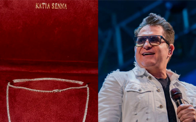 O presente trata-se de um colar Riviera em ouro branco, com 80 centímetros de comprimento e 17,30 quilates distribuídos em 288 diamantes de 6 pontos cada. A peça integra a coleção exclusiva de curadoria da designer de joias Kátia Senna.