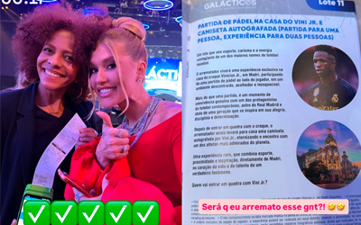 A artista foi a apresentadora da categoria no evento e também entrou na disputa para o lote de Vini. Ela arrematou uma partida de pádel – esporte similar a um jogo de tênis, mas com uma dupla de cada lado da rede – na casa do namorado, em Madri, com o próprio atleta. Além do jogo, ela também ganhou uma camiseta autografada por ele como parte do “pacote”.